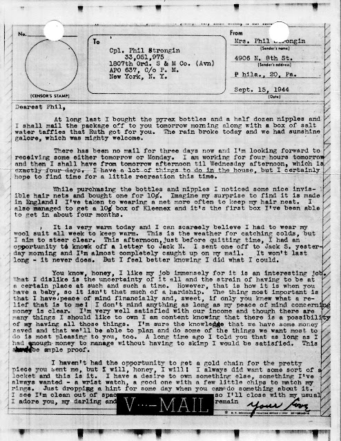 It rained for the third straight day in a row and what I mean rained! A hurricane of large proportion has hit the eastern coast and I understand Atlantic City has been hit hard. I heard reports that Steel Pier was damaged and some of the boardwalk washed away. Today, though it rained, most of the storm consisted of a heavy wind. It wasn't raining when I went to work and since I was rather late I didn't have the opportunity to stop for the bottles. I feel a heel for putting it off day after day, and I'll positively make it my business to stop for them tomorrow without fail. I've sort of caught up on my correspondence, for a change, and I'm catching up on my housework little by little. I just finishing ironing the kitchen curtains. I called Dot this morning and half-promised to stop out there Saturday night to play Gin Rummy, if'n I'm not too tired. Yale is being transferred from Oklahoma to Denver, Colorado as he requested. He claimed the weather in Oklahoma was detrimental to his health and although no one else has ever been transferred for that particular reason, he was the first lucky guy. He has connections in Denver that will benefit him and undoubtedly Shirley will now rejoin him. She has been waiting here at home to learn definitely whether or not he would be transferred. I let Adele call Sarah on the phone this morning and Adele practically carried on a regular conversation with her. She told Sarah that she played in the "playpen" and that it was "raining" out and said "yes" when asked if she was a good girl. I double spaced this evening, sweet, cause it is very late and I’m sort of anxious to hit the hay. Darling, if only I could draw you oh so close, and whisper in your ear how much I adore you.