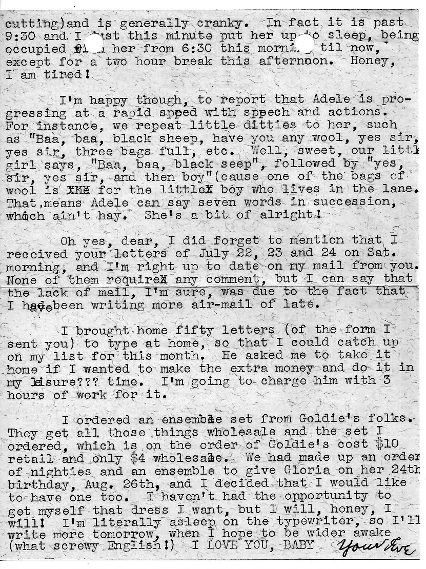 I ordered an ensemble set from Goldie's folks. They get all those things wholesale and the set I ordered, which is on the order of Goldie’s cost $10 retail and only $4 wholesale. We had made up an order of nighties and an ensemble to give Gloria on her 24th birthday, Aug. 26th, and I decided that I would like to have one too. I haven't had the opportunity to get myself that dress I want, but I will, honey, I will! I’m literally asleep on the typewriter, so I'll write more tomorrow, when I hope to be wider awake (what screwy English!) I LOVE YOU, BABY.